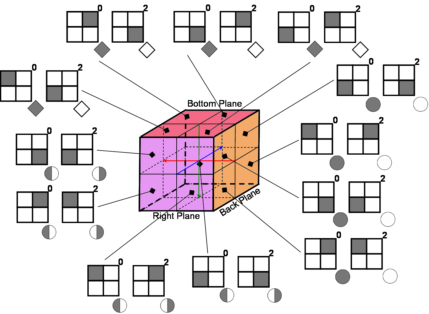 On notera également que 2 possibilités seront chaque fois offertes pour chaque quart de Plan Etendu de Référence (ie. 6x4x2=48 combinaisons). Au besoin on pourra donc également utiliser l'une ou l'autre pour spécifier un côté donné d'une des surfaces (cf Figures ci-dessous).
