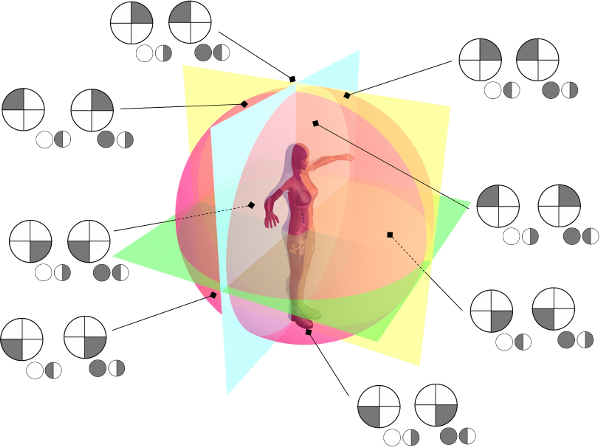 En reprenant le cercle de l'homme de Vitruve, si l'on observe ainsi le modèle de face, depuis son Front Plane, on schématisera ceci par un disque Blanc. S'il est vu de dos, ie depuis son Back Plane, le disque sera Grisé. Une vue depuis le Right Plane sera modélisée par un demi-disque Gauche grisé alors qu'une vue depuis le Left Plane sera schématisée avec le demi-disque Droit grisé. Cette inversion est simplement liée au fait que l'on observe le jongleur de face, le Left Plane est donc à droite tandis que le Right Plane est à gauche. Les schémas ci-dessous mettent ainsi en graphique la vue de Présentation. On nommera cette symbolique l'Indicateur de Vue. Nous réutiliserons cette dénomination par la suite.